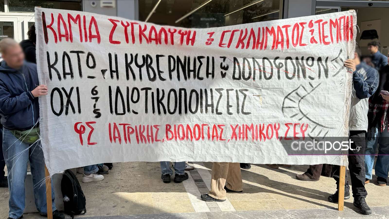 Σε εξέλιξη βρίσκεται στο Ηράκλειο μαθητικό συλλαλητήριο για το τραγικό σιδηροδρομικό δυστύχημα στα Τέμπη. Πλήθος μαθητών και μαθητριών, φοιτητές, φοιτήτριες και εκπαιδευτικοί, συγκεντρώθηκαν στην πλατεία Ελευθερίας του Ηρακλείου, φωνάζοντας συνθήματα και ζητώντας να αποδοθούν ευθύνες σε όσους αναλογούν.