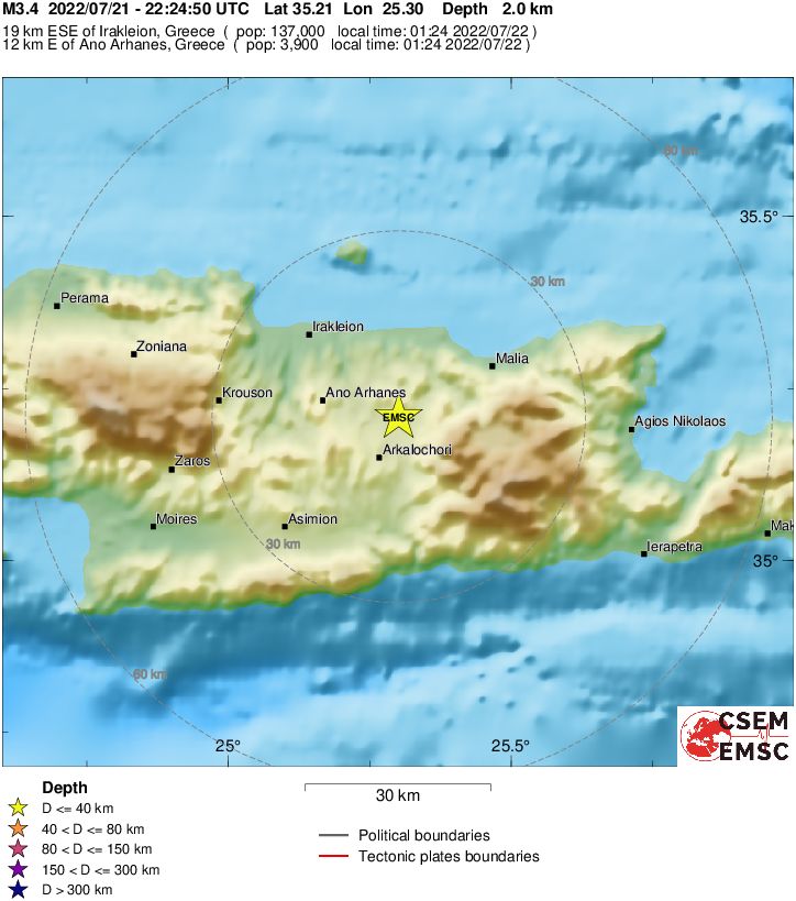 Νέα μετασεισμική δόνηση μεγέθους 3,4 βαθμών της κλίμακας Ρίχτερ, σημειώθηκε τα ξημερώματα της Παρασκευής, στις 01:24 κοντά στο Αρκαλοχώρι του Ηρακλείου Κρήτης, σύμφωνα με την αυτόματη λύση του Ευρωπαϊκού – Μεσογειακού Σεισμολογικού Ινστιτούτου (EMSC).
