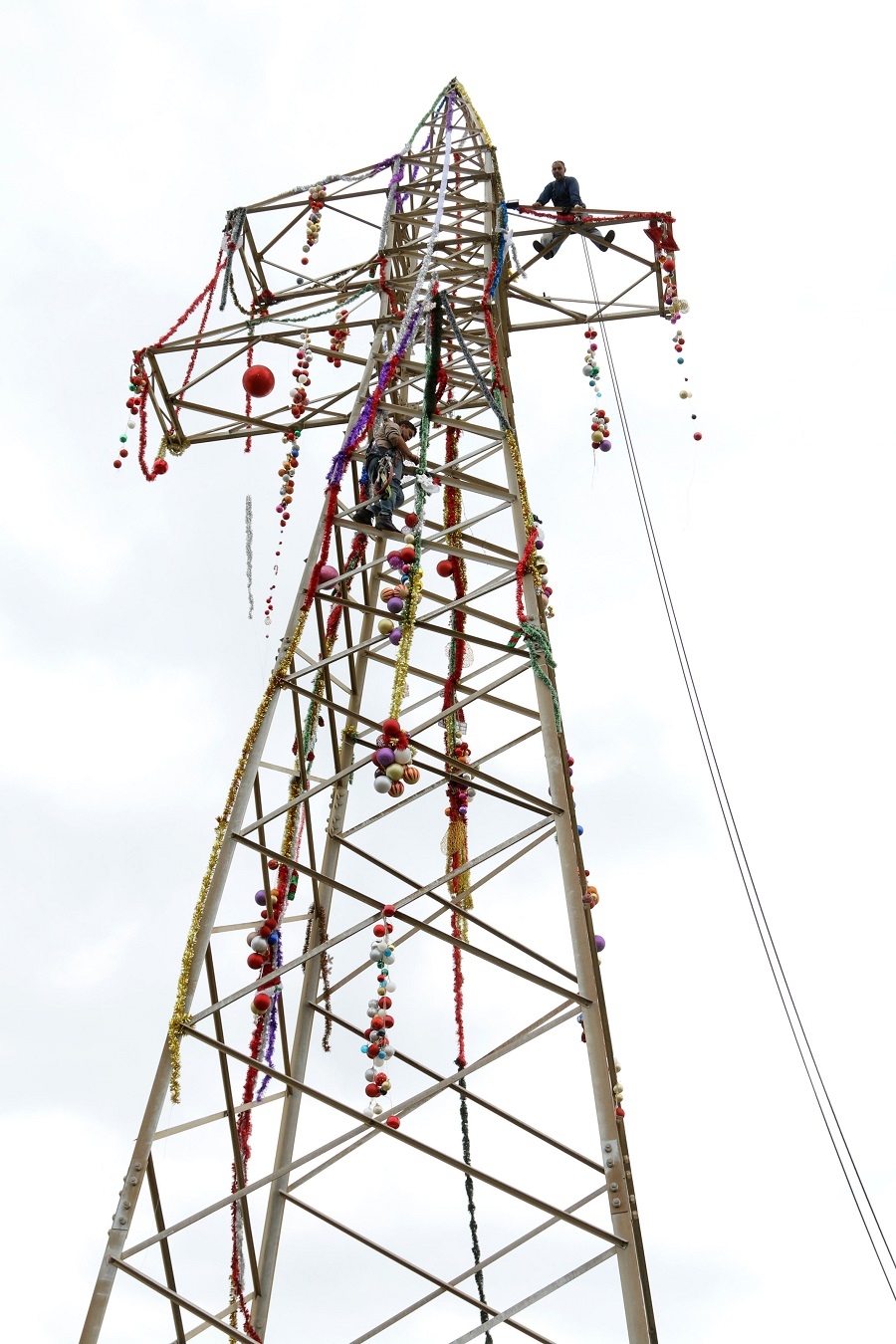 Εναερίτες της επιχείρησης ανέβηκαν στους γιγάντιους πυλώνες του παλιού υποσταθμού της επιχείρησης και τους στόλισαν στο πνεύμα της εποχής.