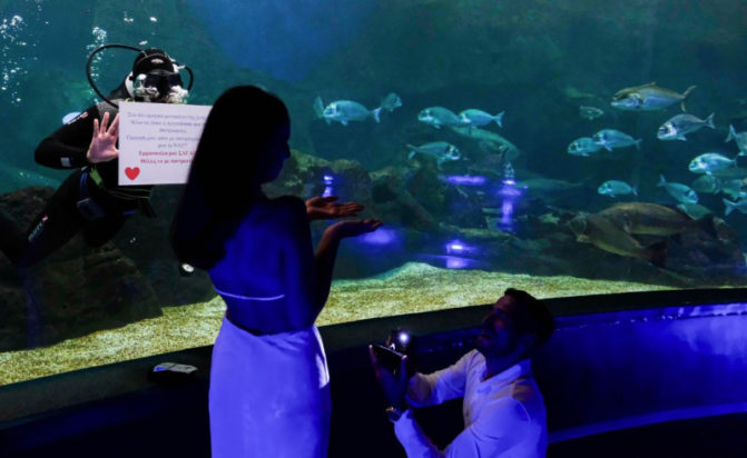 Με τη βοήθεια ενός δύτη και μέσα στο ξεχωριστό περιβάλλον του Ενυδρείου στο Ηράκλειο, επέλεξε ένας άνδρας να κάνει πρόταση γάμου στην αγαπημένη του.