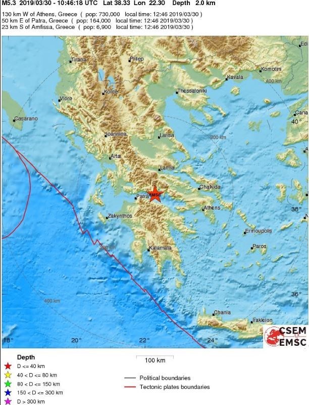 Σύμφωνα με την αυτόματη, προκαταρκτική λύση του Ευρωπαϊκού Μεσογειακού Σεισμολογικού Κέντρου, ο σεισμός στο Γαλαξίδι ήταν μεγέθους 5,3 Ρίχτερ και το εστιακό βάθος υπολογίζεται στα 2 χλμ.