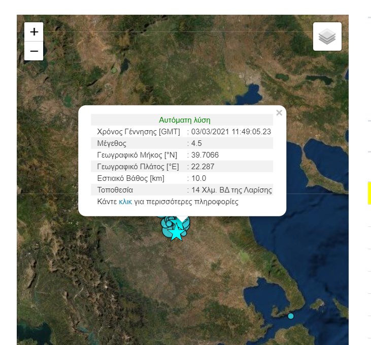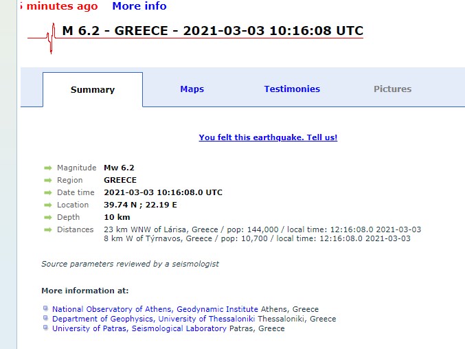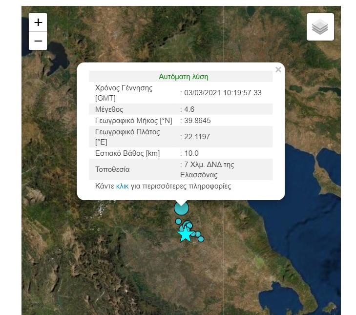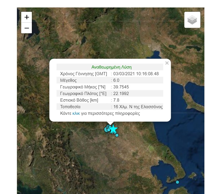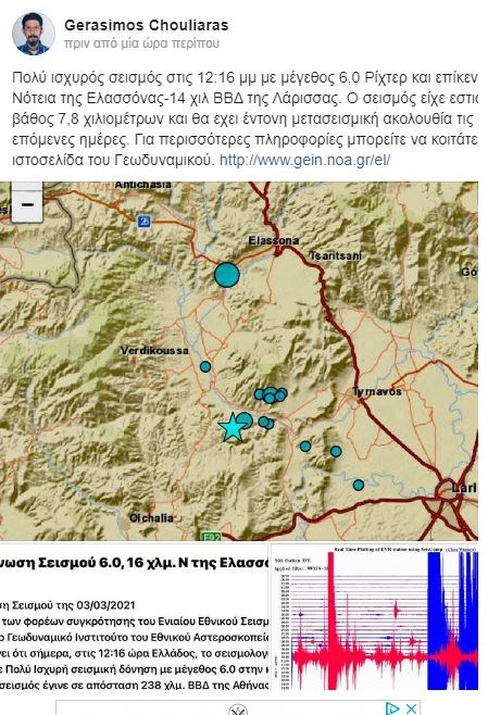 Γράφει συγκεκριμένα: “Πολύ ισχυρός σεισμός στις 12:16 μμ με μέγεθος 6,0 Ρίχτερ και με προκαταρκτικό επίκεντρο 21 Χλμ. ΝΝΔ της Ελασσόνας και 14 χιλ. ΒΒΔ της Λάρισας. Ο σεισμός είχε εστιακό βάθος 7,8 χιλιομέτρων και για περισσότερες πληροφορίες δείτε την ιστοσελίδα του Γεωδυναμικού”.