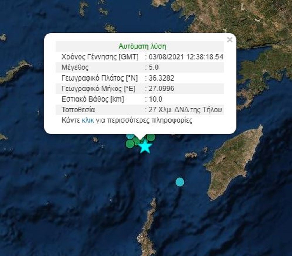 Ισχυρός σεισμός 5 Ρίχτερ σημειώθηκε πριν από λίγο, στη θαλάσσια περιοχή της Τήλου. Σύμφωνα με την αυτόματη λύση του Γεωδυναμικού Ινστιτούτου Αθηνών, το επίκεντρο του σεισμού εντοπίζεται στα 27 χλμ δυτικά, νοτιοδυτικά της Τήλου και το εστιακό βάθος εκτιμάται στα 10 χιλιόμετρα.