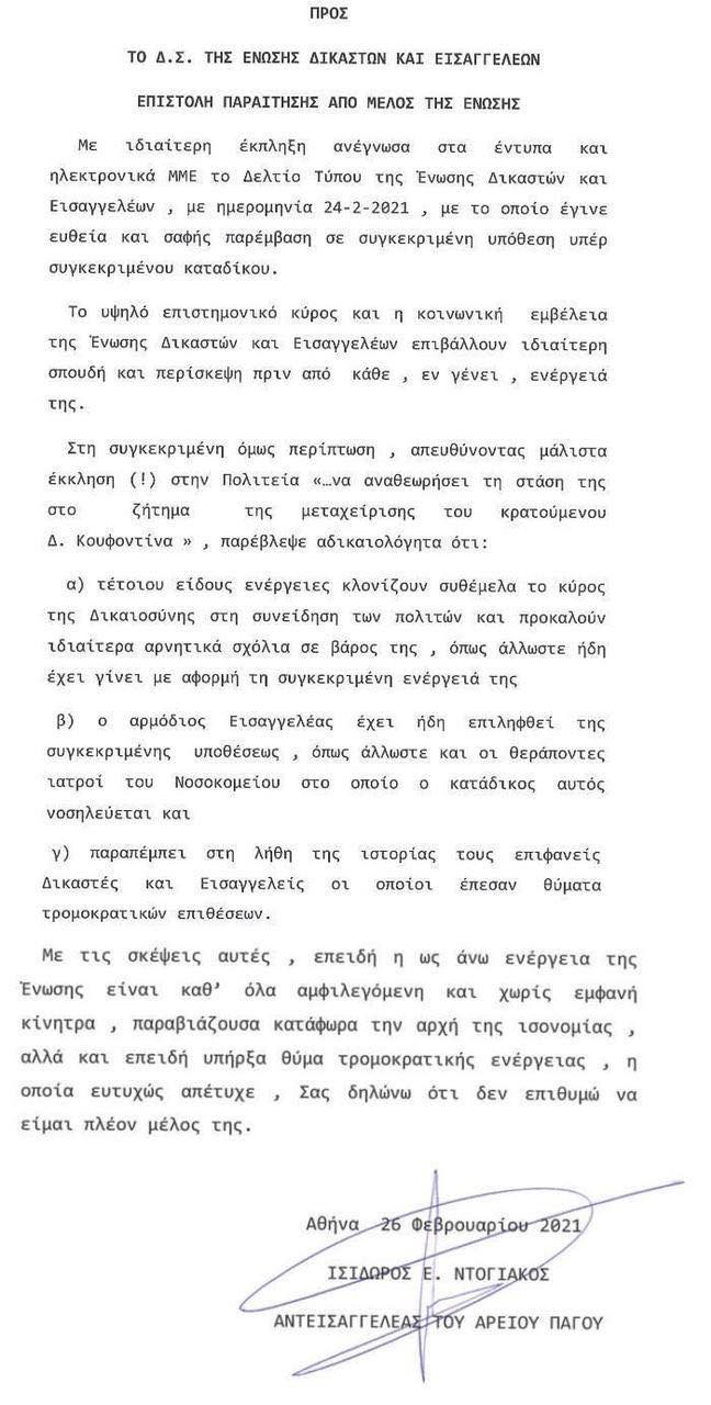 Επιστολή παραίτησης από μέλος της Ένωσης Δικαστών και Εισαγγελέων (ΕΔΕ) απέστειλε ο αντεισαγγελέας του Αρείου Πάγου, Ισίδωρος Ντογιάκος. Με αυτή του την κίνηση ο κ. Ντογιάκος εξέφρασε την έντονη δυσαρέσκειά του για την τελευταία ανακοίνωση της ΕΔΕ, στην οποία ζητούσε από την Πολιτεία να αναθεωρήσει τη στάση της για τον Δημήτρη Κουφοντίνα.
