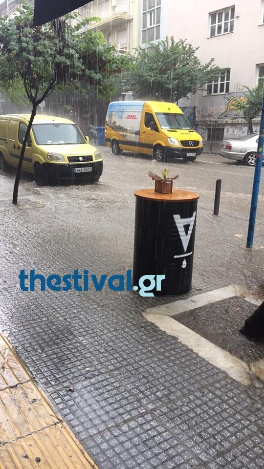 Ισχυρή καταιγίδα έπληξε και σήμερα την πόλη της Θεσσαλονίκης. Έντονη βροχόπτωση μετέτρεψε τους δρόμους της πόλης σε ποτάμια.