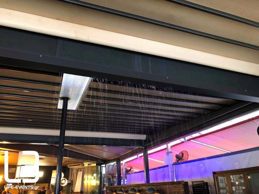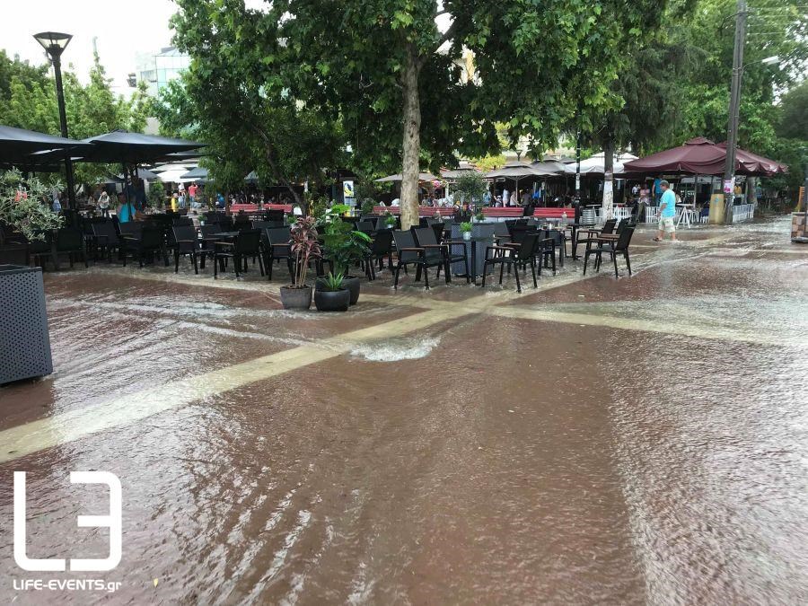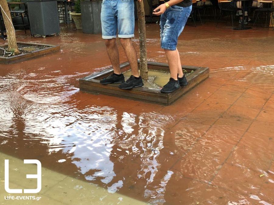 Η πλατεία του Ευόσμου, από την έντονη βροχόπτωση μετατράπηκε σε λίμνη, με αποτέλεσμα ο κόσμος να αναγκαστεί να αναζητήσει καταφύγιο για να προστατευτεί. Ωστόσο, υπήρχαν και εκείνοι που συνέχισαν ατάραχοι να πίνουν τον καφέ τους.
