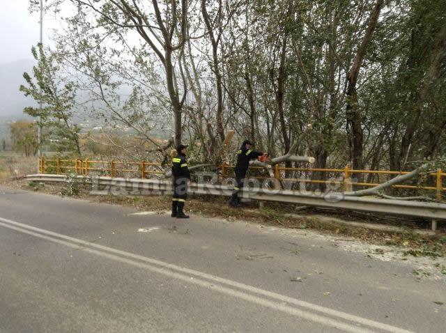 Χαρακτηριστικά, μια μεγάλη λεύκα έπεσε στην παλιά γέφυρα από Λαμία προς Φραντζή. Οι πυροσβέστες, απομάκρυναν το δέντρο από το δρόμο.
