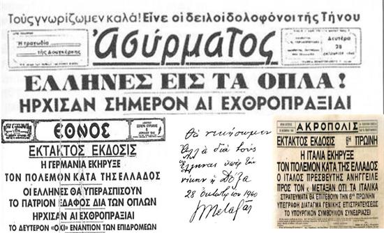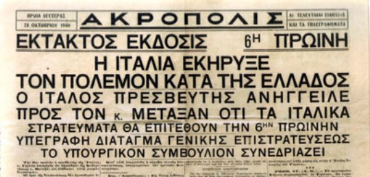 Τα χαράματα της Δευτέρας 28 Οκτωβρίου και συγκεκριμένα στις 3 το πρωί, ο πρέσβης της Ιταλίας Εμανουέλε Γκράτσι επιδίδει τελεσίγραφο στον Ιωάννη Μεταξά, με το οποίο του γνωστοποιεί την πρόθεση της Ιταλίας να καταλάβει θέσεις εντός της ελληνικής επικράτειας, συνοδευόμενο από τη δήλωση ότι, αν η Ελλάδα δεν συμμορφωθεί εντός 3 ωρών, ο ιταλικός στρατός θα εισβάλλει στο ελληνικό έδαφος. Η απάντηση του έλληνα πρωθυπουργού (Alors,c’est la guerre: Λοιπόν έχουμε πόλεμο), που έμεινε στην ιστορία ως το ΟΧΙ του Μεταξά, εξέφρασε τη θέληση του ελληνικού λαού να μην υποταχθεί.