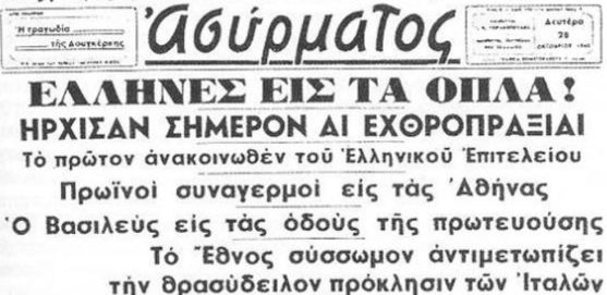 «Ο Πρόεδρος της Κυβερνήσεως σας ανήγγειλε προ ολίγου υπό ποίους όρους ηναγκάσθημεν να κατέλθωμεν εις πόλεμον κατά της Ιταλίας, επιβουλευθείσης την ανεξαρτησίαν της Ελλάδος.Κατα την Μεγάλην αυτήν στιγμήν είμαι βέβαιος ότι κάθε Ελλην και κάθε Ελληνίς θα εκτελέσωσι το καθήκον των μέχρι τέλους και θα φανώσιν αντάξιοι της ενδόξου ημών ιστορίας. Με πίστη εις τον Θεόν και εις τα πεπρωμένα της φυλής, το Εθνος σύσσωμον και πειθαρχούν ως εις άνθρωπος θα αγωνισθή υπέρ βωμών και εστιών μέχρι τελικής νίκης.»