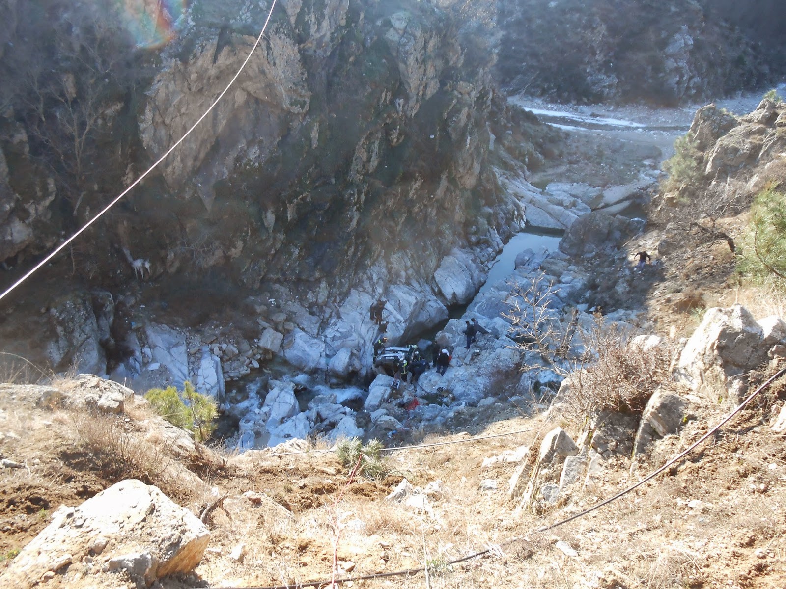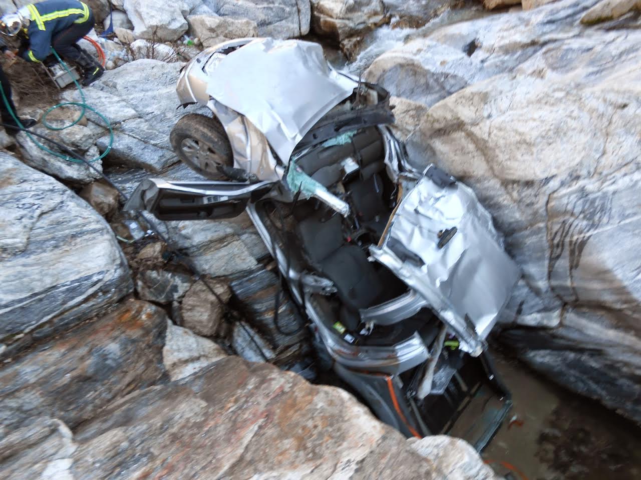 Από την πτώση το όχημα ανετράπη με αποτέλεσμα να εγκλωβιστούν οι δύο επιβάτες. Στο σημείο έσπευσαν άμεσα η αστυνομία αλλά και η πυροσβεστική για τον απεγκλωβισμό των δύο επιβατών του οχήματος. Με τη χρήση διασωστικών εργαλείων κατάφεραν να απεγκλωβίσουν τους τραυματισμένους που βρίσκονταν μέσα στο Ι.Χ. ενώ με τη χρήση ορειβατικού εξοπλισμού τους μετέφεραν από χαράδρα στο οδόστρωμα.