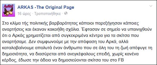 «Στο κλίμα της πολιτικής βαρβαρότητας κάποιοι παρεξήγησαν κάποιες αναρτήσεις και έκαναν κακοήθη σχόλια. Έφτασαν σε σημείο να υπαινιχθούν ότι ο Αρκάς χρηματίζεται από συγκεκριμένα κέντρα για τα σκίτσα που αναρτήσαμε. Δεν συμφωνούμε με την απόφαση του Αρκά, αλλά καταλαβαίνουμε απολυτά έναν άνθρωπο που σε όλη του τη ζωή απέφυγε τη δημοσιότητα, να διασύρεται από ανεγκέφαλους επειδή, χωρίς κανένα κέρδος, έδωσε την άδεια να δημοσιεύονται σκίτσα του στο FB».