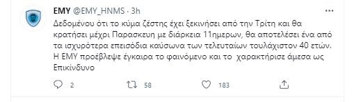 Ολόκληρη η ανάρτηση της ΕΜΥ έχει ως εξής: «Δεδομένου ότι το κύμα ζέστης έχει ξεκινήσει από την Τρίτη και θα κρατήσει μέχρι Παρασκευή με διάρκεια 11 ημερών, θα αποτελέσει ένα από τα ισχυρότερα επεισόδια καύσωνα των τελευταίων τουλάχιστον 40 ετών. Η ΕΜΥ προέβλεψε έγκαιρα το φαινόμενο και το χαρακτήρισε άμεσα ως Επικίνδυνο».