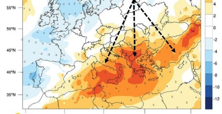 Στο χάρτη που ακολουθεί αποτυπώνεται η απόκλιση της θερμοκρασίας σε σχέση με τις κανονικές για την εποχή τιμές της σε υψόμετρο 1500 μέτρων πάνω από την επιφάνεια της θάλασσας την Παρασκευή 21/7.