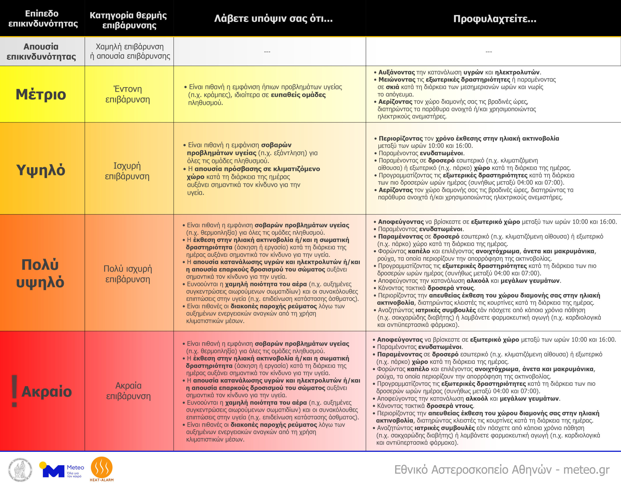 Αναλυτικά, όπως επισημαίνεται, ο βαθμός και η επικινδυνότητα αυτής της επιβάρυνσης εξαρτάται, πέρα από την θερμοκρασία, από την υγρασία, τον άνεμο, και την ακτινοβολία περιβάλλοντος, αλλά και από προσωπικές παραμέτρους (φύλο, ηλικία, βάρος, ύψος, επίπεδο ένδυσης και σωματικής δραστηριότητας). Λαμβάνοντας υπόψη όλους τους σχετικούς παράγοντες, το βιομετεωρολογικό σύστημα προειδοποίησης HEAT-ALARM εκδίδει προειδοποιήσεις σε κάθε περιφερειακή ενότητα της χώρας για ημέρες κατά τις οποίες η θερμή επιβάρυνση μπορεί να οδηγήσει σε σοβαρά προβλήματα υγείας.