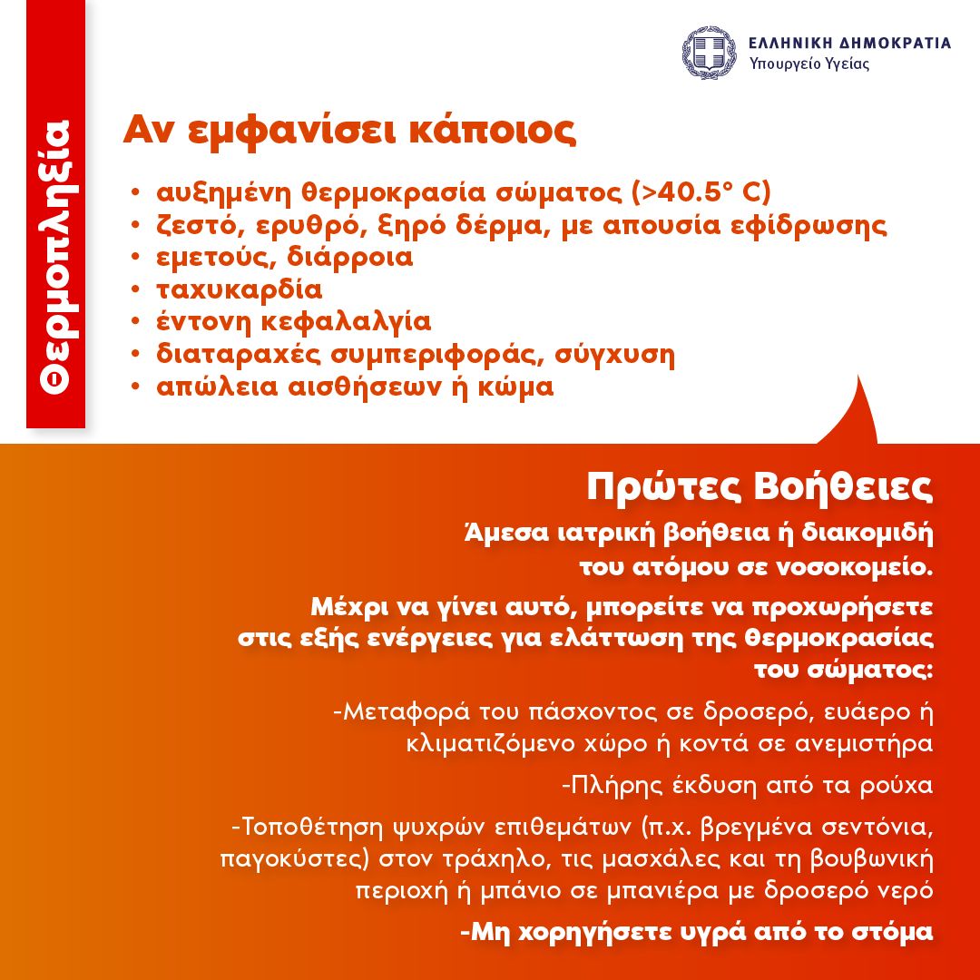 Το υπουργείο Υγείας έδωσε στη δημοσιότητα γραφήματα για την αντιμετώπιση της θερμικής εξάντλησης και της θερμοπληξίας, την προστασία από τον καύσωνα, την φροντίδα ευάλωτων ομάδων και για τα μέτρα για την αποφυγή εισπνοής καπνού/στάχτης από πυρκαγιά, με στόχο την καλύτερη ενημέρωση του κοινού.