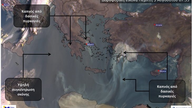 Χαμηλή είναι και σήμερα η ποιότητα του αέρα πάνω από τη χώρα μας και γενικότερα την Ανατολική Μεσόγειο εξαιτίας των πολλών πυρκαγιών στην περιοχή. Μια δορυφορική εικόνα ορατού φάσματος που το Εθνικό Αστεροσκοπείο Αθηνών/meteo.gr επεξεργάστηκε νωρίς το πρωί σήμερα, αποκαλύπτει τη μετεωρολογική κατάσταση που επικρατεί στην Ανατολική Μεσόγειο. Ένας μεγάλος αριθμός δασικών πυρκαγιών που βρίσκεται σε εξέλιξη, κυρίως σε Ελλάδα και Τουρκία, απελευθερώνει πολύ μεγάλες ποσότητες μικροσωματιδίων στην ατμόσφαιρα. Ο καπνός παρασύρεται εκατοντάδες χιλιόμετρα μακριά από τις εστίες των πυρκαγιών και φτάνει μέχρι τη Βόρεια Αφρική.