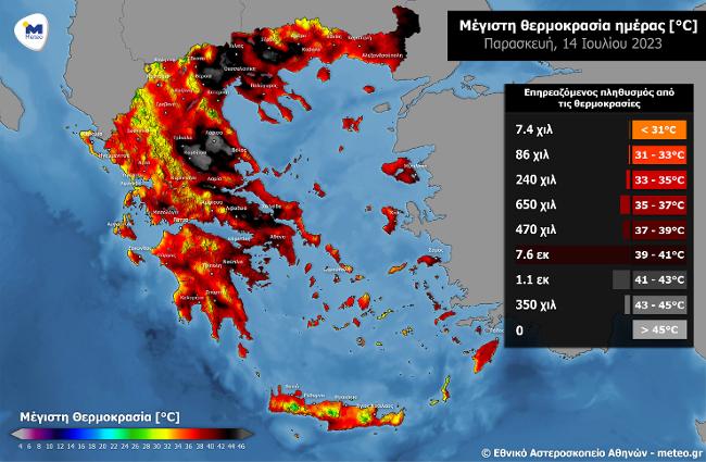 Σύμφωνα με τα προγνωστικά στοιχεία του Εθνικού Αστεροσκοπείου Αθηνών / meteo.gr, κορύφωση του κύματος καύσωνα «Κλέων»αναμένεται στη χώρα την Παρασκευή 14/7, με τις μέγιστες θερμοκρασίες να φτάνουν τοπικά τους 42-43 βαθμούς Κελσίου. Αυτό θα έχει ως αποτέλεσμα την έκθεση του μεγαλύτερου μέρους του πληθυσμού σε πολύ υψηλές μέγιστες θερμοκρασίες.