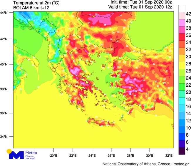 Συγκεκριμένα, η θερμοκρασία τις μεσημεριανές ώρες σήμερα στη Θεσσαλία, στην Ανατολική Στερεά (Βοιωτία) και στη Νότια Πελοπόννησο θα φτάσει τους 39-40 βαθμούς Κελσίου, ενώ στα νησιά του Ανατολικού Αιγαίου, στη Νότια Κρήτη και τοπικά στη Μακεδονία τους 36-37 βαθμούς Κελσίου.