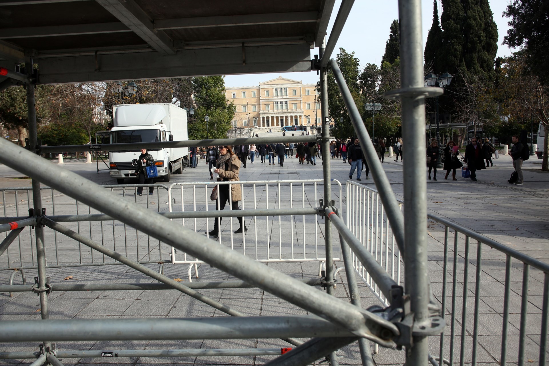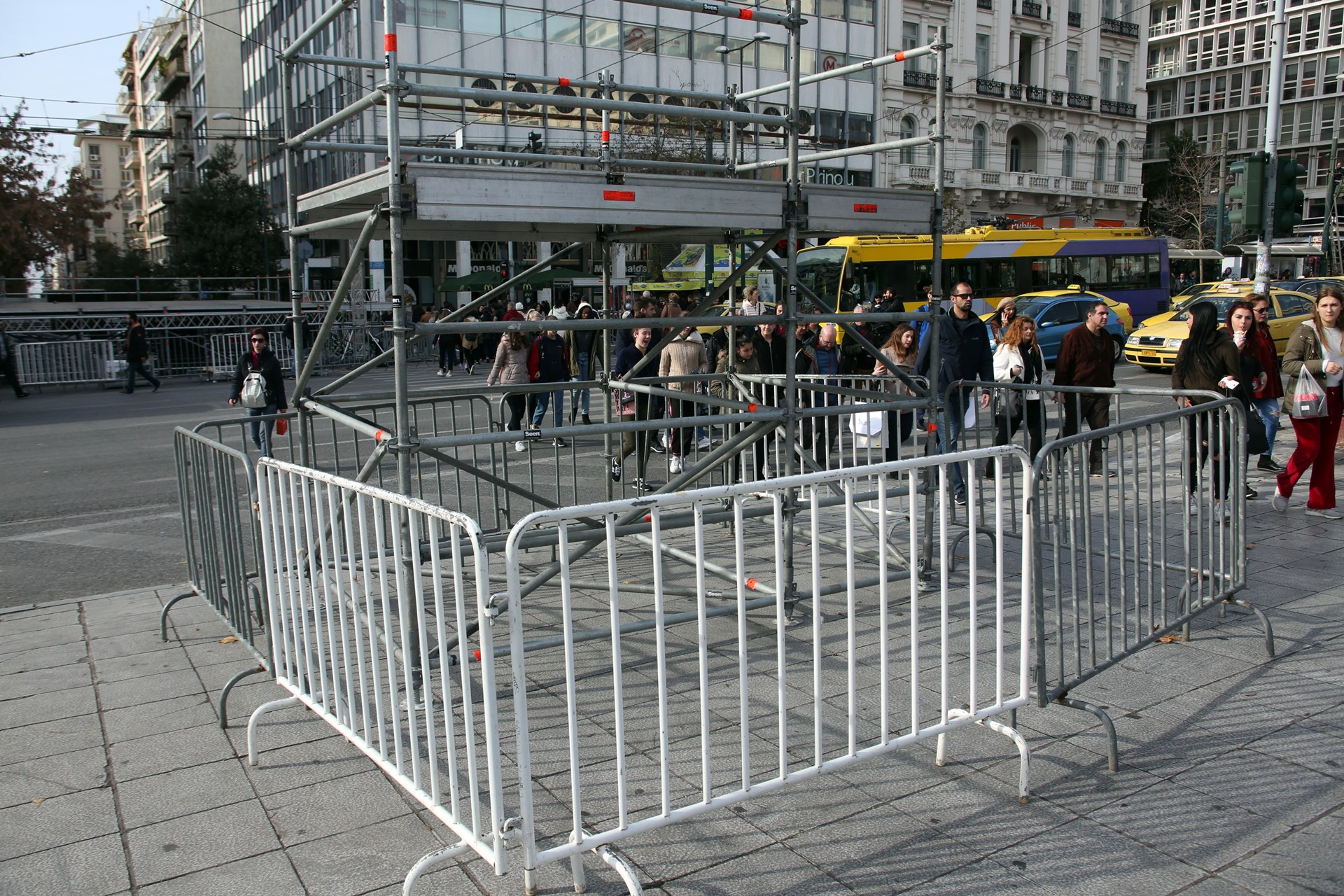 Στο πλαίσιο των προετοιμασιών έχουν τοποθετηθεί μεγάφωνα στις κολόνες στην πλατεία Συντάγματος και κάγκελα.