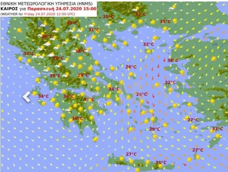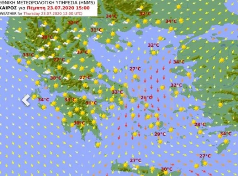 Θερμοκρασία: Από 20 έως 34 και στα ηπειρωτικά έως 37 βαθμούς Κελσίου. Στην Ήπειρο η ελάχιστη κατά τόπους 3 με 5 βαθμούς χαμηλότερη.