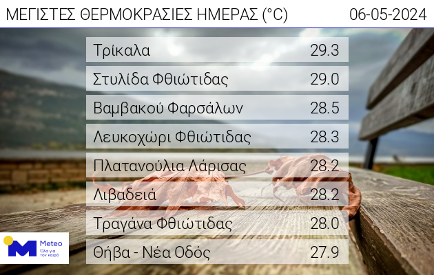 Η μέγιστη θερμοκρασία σημειώθηκε στο μετεωρολογικό σταθμό στα Τρίκαλα και ήταν ίση με 29.3 βαθμούς Κελσίου.
