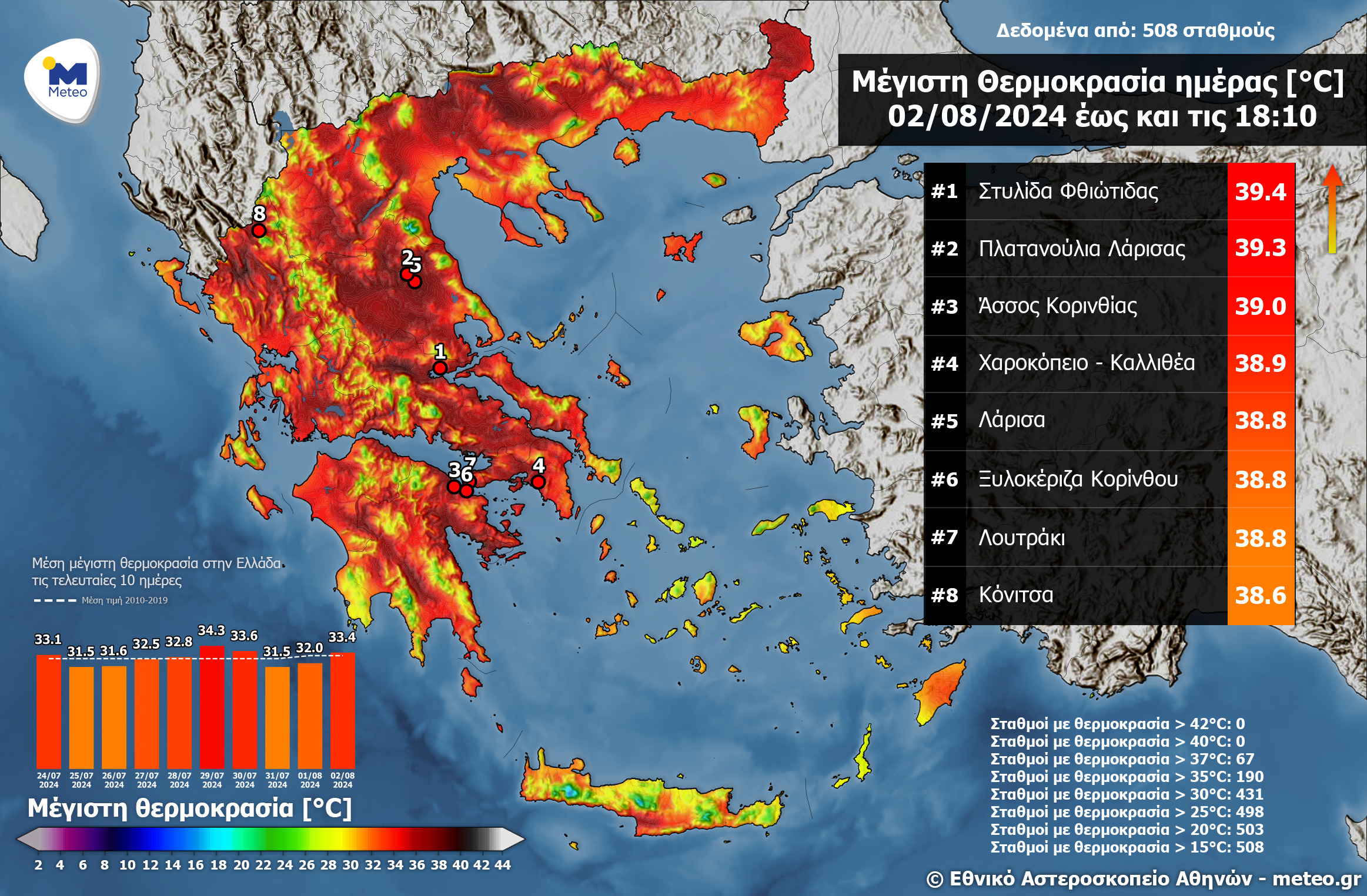 Μάλιστα, σύμφωνα με το δίκτυο αυτόματων μετεωρολογικών σταθμών του Εθνικού Αστεροσκοπείου Αθηνών / meteo.gr, η μέγιστη θερμοκρασία την Παρασκευή 02/08 καταγράφηκε στη Στυλίδα Φθιώτιδας και ήταν ίση με 39.4 °C.