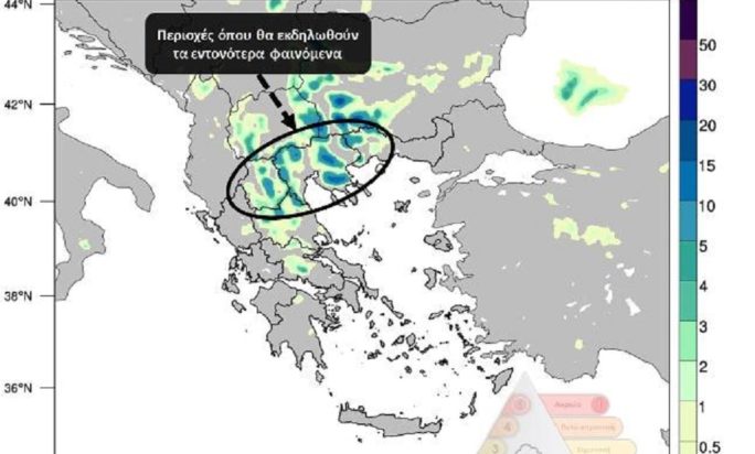 Βροχές και καταιγίδες θα εκδηλωθούν κυρίως στην Κεντρική και Βόρεια Ελλάδα, τις μεσημεριανές και απογευματινές ώρες. Σύμφωνα με την κατηγοριοποίηση του επεισοδίου βροχόπτωσης (RPI), η οποία εφαρμόζεται από τη μονάδα Meteo του Εθνικού Αστεροσκοπείου Αθηνών, το αναμενόμενο επεισόδιο βροχόπτωσης κατατάσσεται στην Κατηγορία 1 (Χαμηλή).