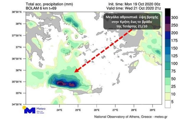 Από τις βραδινές ώρες της Τρίτης, προειδοποιεί το meteo, ο καιρός στο Νότιο Αιγαίο αναμένεται να παρουσιάσει σημαντική επιδείνωση με ισχυρές βροχές και καταιγίδες, φαινόμενα τα οποία στην Κρήτη αναμένεται να επιμείνουν έως τις πρωινές ώρες της Πέμπτης, δίνοντας πολύ μεγάλα ύψη βροχόπτωσης.