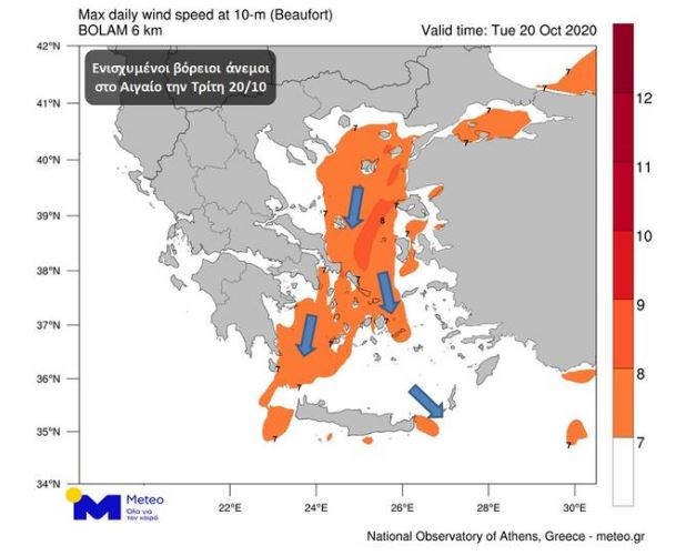 Οι εντάσεις των βοριάδων στο Αιγαίο κατά το διήμερο Τρίτης και Τετάρτης θα φτάνουν τοπικά τα οκτώ μποφόρ.