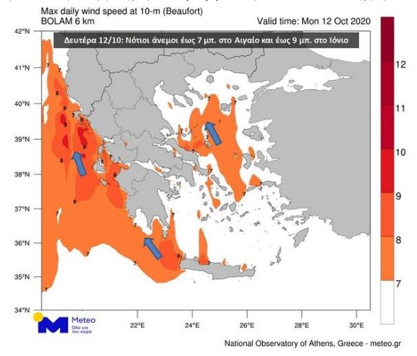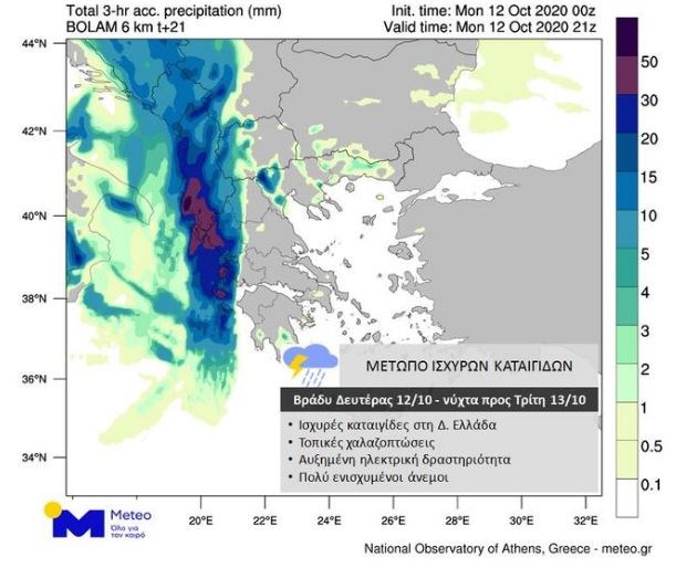 Σήμερα, βροχές ή καταιγίδες τοπικού χαρακτήρα θα εκδηλωθούν μετά το μεσημέρι στα δυτικά και βόρεια. Ωστόσο, από αργά το βράδυ της Δευτέρας έως και τις πρώτες ώρες μετά τα μεσάνυχτα, η Δυτική Ελλάδα θα επηρεαστεί από κατά τόπους πολύ έντονα φαινόμενα, τα οποία θα έχουν τη μορφή μετώπου. Πολύ αυξημένη είναι η πιθανότητα χαλαζοπτώσεων. Κατά τη διάρκεια της διέλευσης του μετώπου των καταιγίδων από το Ιόνιο, οι νότιοι άνεμοι θα παρουσιάσουν πρόσκαιρη ενίσχυση στα 8-9 μποφόρ.