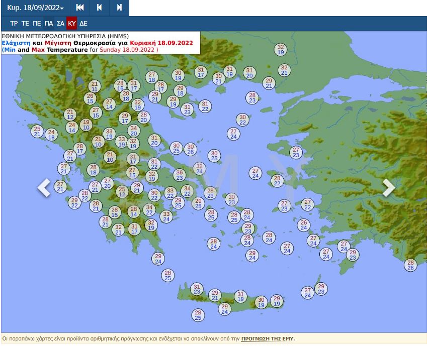 Η θερμοκρασία στη Δυτική Μακεδονία θα κυμανθεί από 9 έως 27 βαθμούς Κελσίου, στην υπόλοιπη Μακεδονία και στη Θράκη από 14 έως 30, στη Θεσσαλία από 16 έως 31, στην Ήπειρο από 14 έως 31, στη Στερεά και στην Πελοπόννησο από 15 έως 31, στα νησιά του Ιονίου από 17 έως 29, στα νησιά του Βορείου Αιγαίου από 15 έως 29, στα νησιά του Ανατολικού Αιγαίου από 18 έως 31, στις Κυκλάδες από 17 έως 28, στα Δωδεκάνησα από 22 έως 30 και στην Κρήτη από 16 έως 31 βαθμούς Κελσίου.
