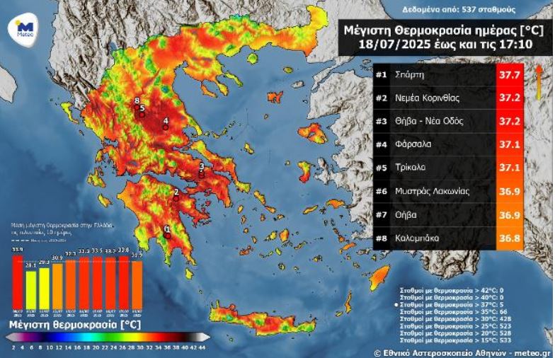 Μικρή υποχώρηση παρουσίασε η θερμοκρασία στη χώρα την Παρασκευή 18/07. Σύμφωνα με το δίκτυο αυτόματων μετεωρολογικών σταθμών του Εθνικού Αστεροσκοπείου Αθηνών / meteo.gr η μέγιστη θερμοκρασία καταγράφηκε στη Σπάρτη (37.7 °C) και ακολούθησαν η Νεμέα Κορινθίας και η Θήβα-Νέα Οδός (37.2 °C).