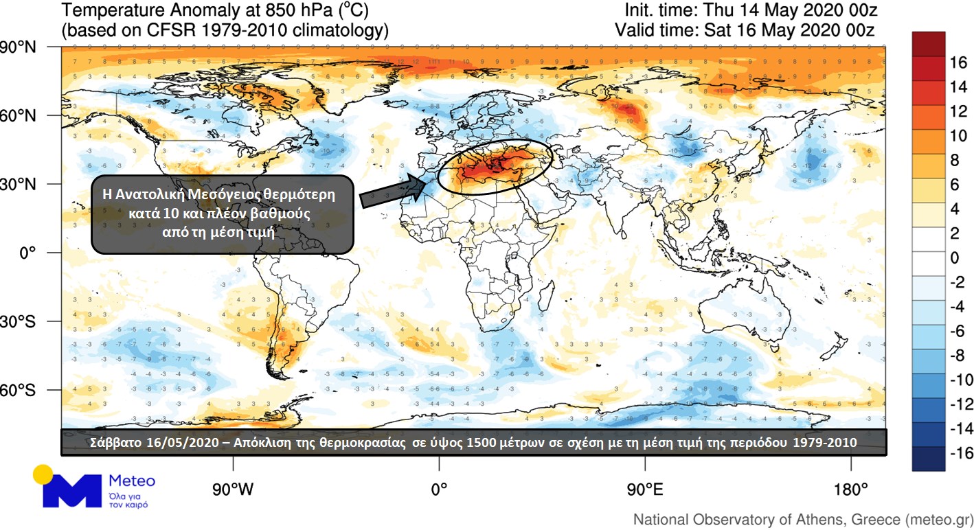 Στη χώρα μας, η αναμενόμενη απόκλιση από τη μέση τιμή της θερμοκρασίας για αυτήν την εποχή θα ξεπεράσει τους 10 βαθμούς Κελσίου και θα είναι η μεγαλύτερη που θα καταγραφεί σε όλον τον πλανήτη τις επόμενες ημέρες.