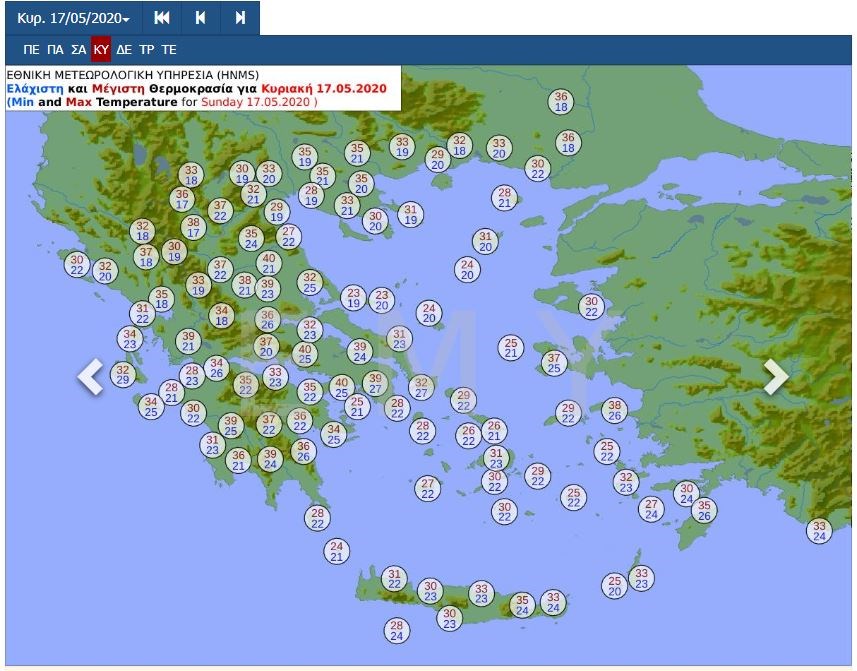 Ιδιαίτερα υψηλές θερμοκρασίες καταγράφονται ήδη στην Ανατολική Μεσόγειο κατά το δεύτερο δεκαήμερο του Μαΐου. Οι θερμές αέριες μάζες θα παραμείνουν στη χώρα μας έως και την ερχόμενη Δευτέρα, οπότε θα αρχίσουν να κινούνται ανατολικά.