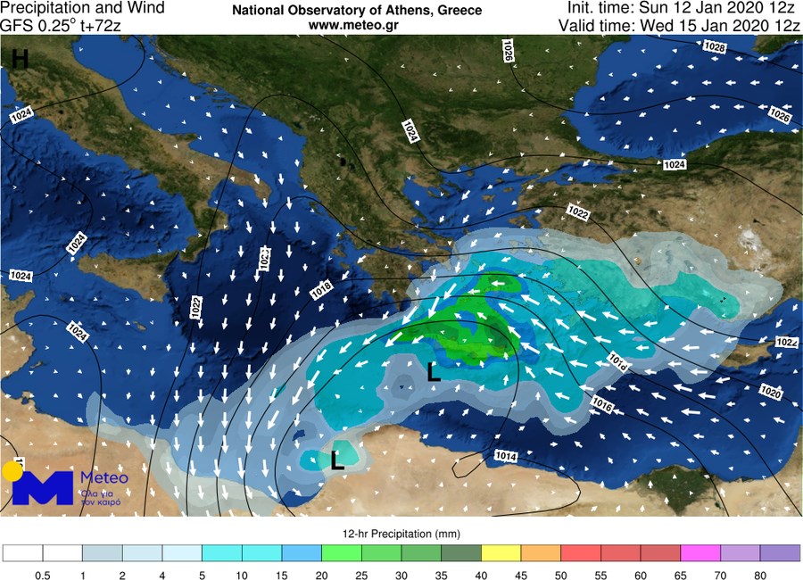 Στους παρακάτω χάρτες φαίνεται η θέση του κέντρου του χαμηλού (σημειώνεται με “L”), ο ολικός υετός του προηγούμενου 12ώρου καθώς και το πεδίο των ανέμων για το βράδυ της Τρίτης 14/1 προς Τετάρτη 15/1 και για το μεσημέρι της Τετάρτης 15/1.