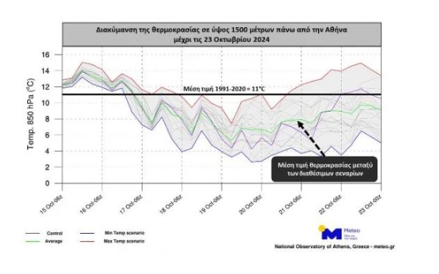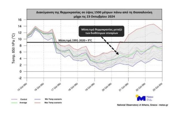 Στην εικόνες που ακολουθούν παρουσιάζεται ενδεικτικά το εύρος διακύμανσης της θερμοκρασίας έως τις 23/10 σε ύψος 1500 περίπου μέτρων επάνω από την Αθήνα και τη Θεσσαλονίκη.