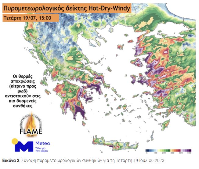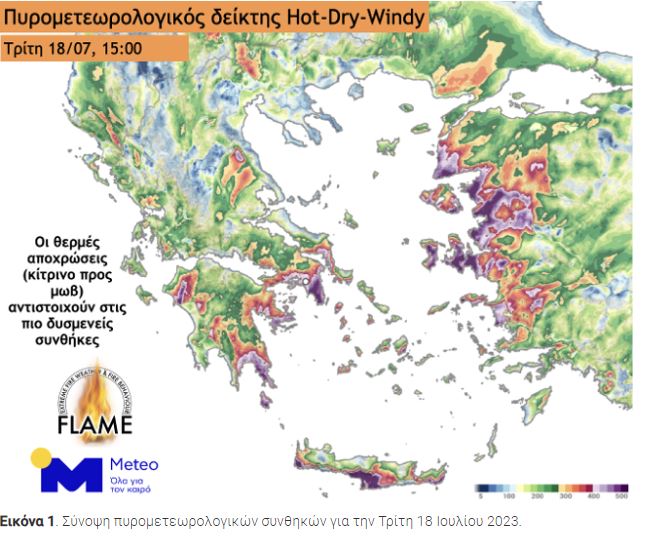 Συνολικά, οι πυρομετεωρολογικές συνθήκες την Τρίτη 18.07.2023 και την Τετάρτη 19.07.2023 αναμένεται να χαρακτηριστούν από τον ιδιαίτερα επικίνδυνο, για την εκδήλωση και εξάπλωση δασικών πυρκαγιών, τύπο καιρού Hot – Dry – Windy.