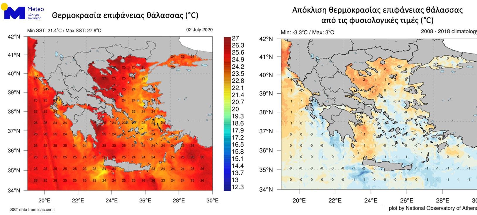 Το τελευταίο δεκαήμερο του Ιουνίου 2020 επικράτησαν ασυνήθιστα ασθενείς άνεμοι στο Βορειοδυτικό Αιγαίο Πέλαγος και σε συνδυασμό με τις υψηλές θερμοκρασίες που σημειώθηκαν και συνεχίζονται λόγω του αίθριου καιρού, η θερμοκρασία της επιφάνειας της θάλασσας αυξήθηκε σημαντικά ξεπερνώντας τοπικά τους 27°C νότια του Θερμαϊκού κόλπου. Το γράφημα που ακολουθεί δείχνει την εκτίμηση της θερμοκρασίας της επιφάνειας της θάλασσας από δορυφορικές μετρήσεις του αμερικάνικου δορυφόρου ΝΟΑΑ-18 (οι οποίες είναι σύμφωνες και με επιπλέον μετρήσεις ευρωπαϊκών δορυφόρων) και την απόκλιση των τιμών από τη μέση τιμή της περιόδου 2008-2018 την Πέμπτη 2 Ιουλίου 2020.
