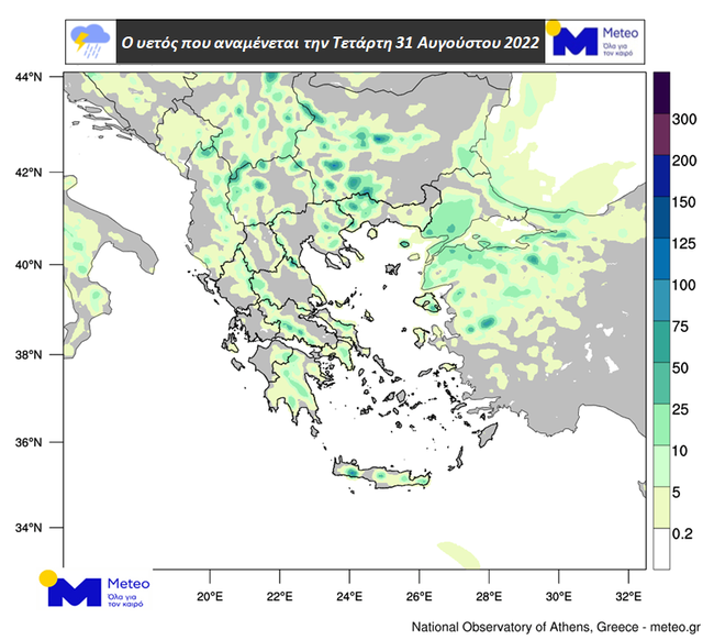 Χάρτης 1. Ο αθροιστικός υετός που αναμένεται την Τετάρτη 31/08 – ΠΗΓΗ ΦΩΤΟ meteo.gr