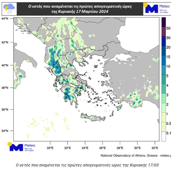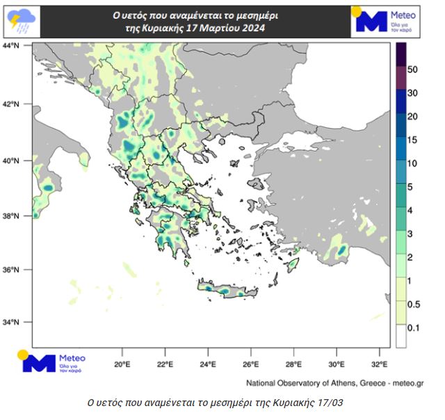 Στους χάρτες που ακολουθούν παρουσιάζεται ο υετός που αναμένεται το μεσημέρι και τις πρώτες απογευματινές ώρες της Κυριακής 17/03.