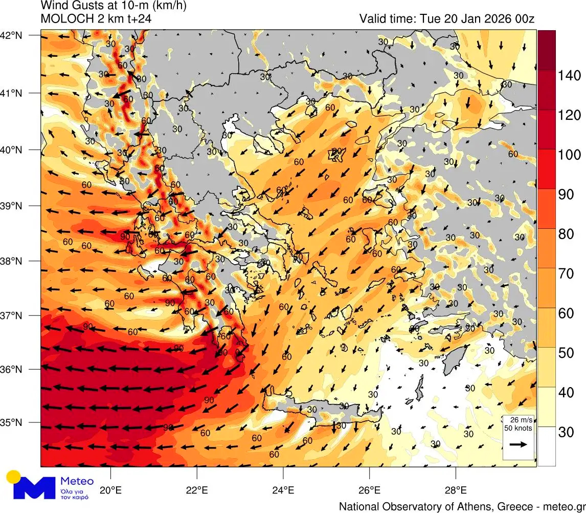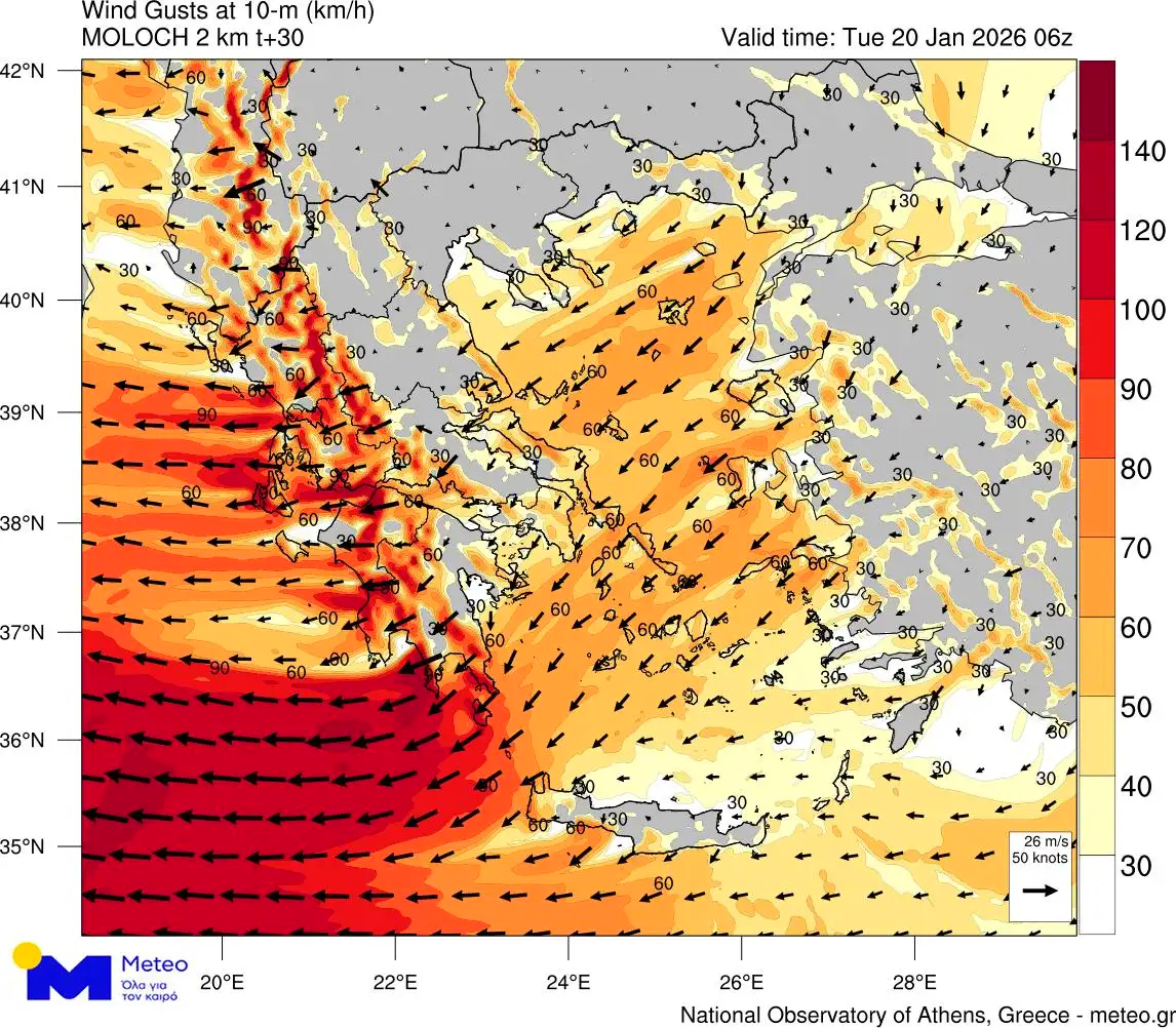 Παράλληλα, σύμφωνα με το meteo του Εθνικού Αστεροσκοπείου Αθηνών, πολύ θυελλώδεις ανατολικοί άνεμοι θα επικρατήσουν την Τρίτη, κυρίως στα νοτιοδυτικά τμήματα, όπου οι ριπές θα φτάσουν τα 110 έως 120 χλμ/ώρα. Οι μεγαλύτερες εντάσεις αναμένονται στις πρώτες πρωινές και απογευματινές ώρες, με τον άνεμο να ενισχύεται ιδιαίτερα στο Ιόνιο και τη νότια Πελοπόννησο.