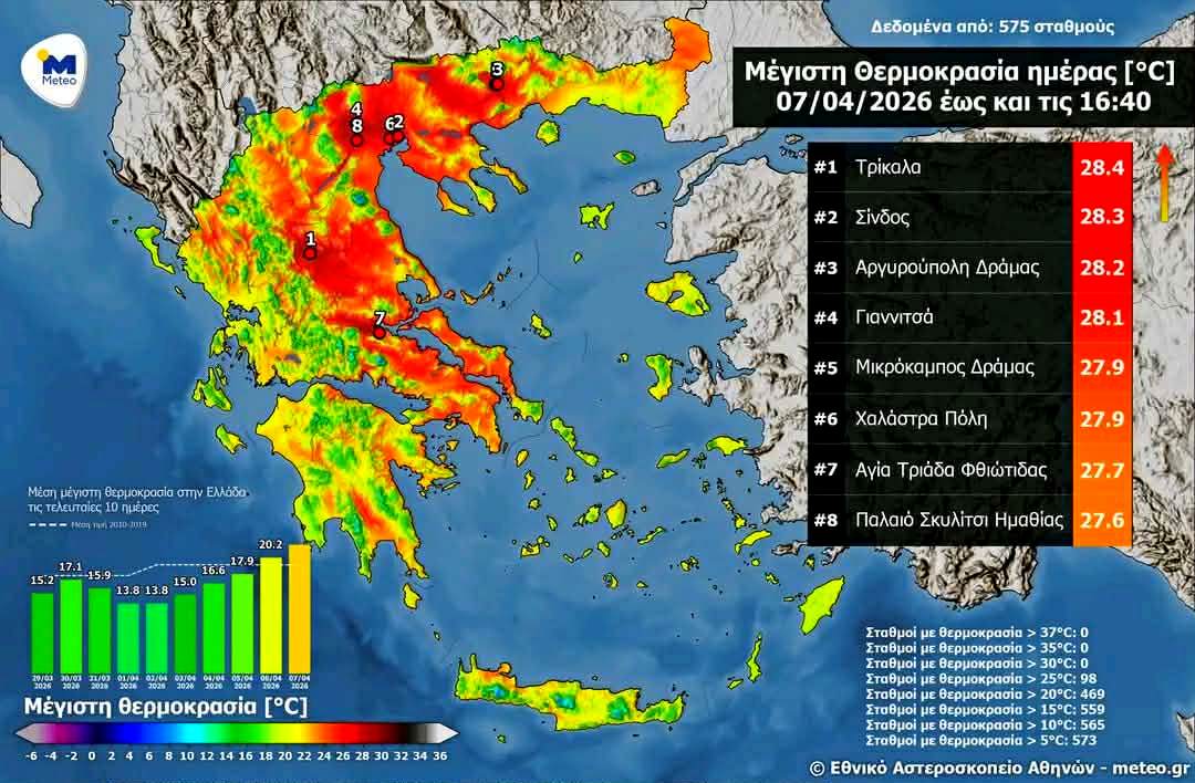 Στον παρακάτω χάρτη παρουσιάζονται οι μέγιστες θερμοκρασίες στη χώρα μας έως τις 16:40 της Μ. Τρίτης 07 Απριλίου 2026, ενώ στον πίνακα παρουσίαζονται οι 8 υψηλότερες μέγιστες θερμοκρασίες.