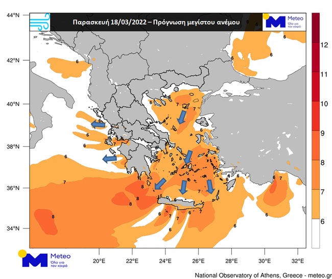 Παράλληλα, ενισχυμένοι άνεμοι αναμένονται στα πελάγη. Στο Αιγαίο θα επικρατήσουν βόρειοι έως ανατολικοί άνεμοι 5 έως 7 μποφόρ με μικρή ενίσχυση από το απόγευμα οπότε στα κεντρικά και νότια τμήματά του θα φτάνουν τοπικά και τα 7 έως 8 μποφόρ. Στο Ιόνιο αναμένονται ανατολικοί άνεμοι 4 έως 6 μποφόρ και από το απόγευμα 5 έως 7 μποφόρ. Στον Πατραϊκό Κόλπο οι άνεμοι θα φτάνουν τα 7 έως 8 μποφόρ. Αξίζει να σημειωθεί ότι λόγω των ενισχυμένων ανέμων στις νησιωτικές περιοχές αλλά κατά τόπους και στα κεντρικά και νότια ηπειρωτικά το αίσθημα κρύου θα είναι ισχυρό. Στον σχετικό χάρτη παρουσιάζονται οι περιοχές όπου ο άνεμος αναμένεται να ξεπεράσει τα 7 μποφόρ καθώς και η επικρατούσα διεύθυνσή του.