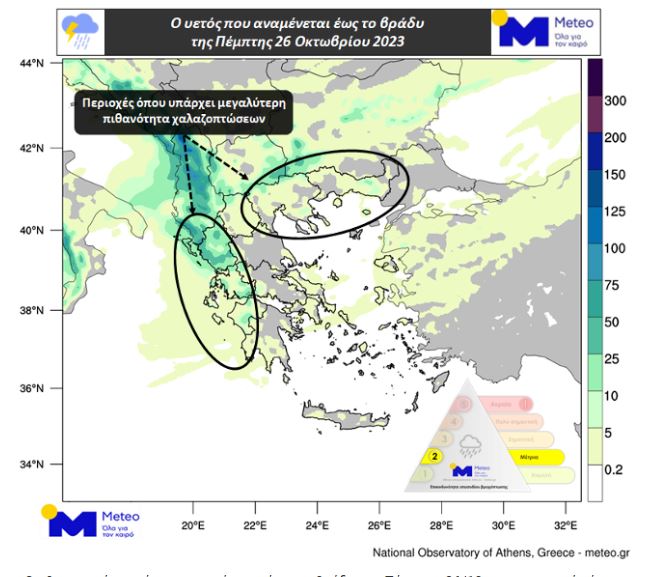 Στον χάρτη που ακολουθεί παρουσιάζεται ο αθροιστικός υετός που αναμένεται έως το βράδυ της Πέμπτης 26/10 καθώς και οι περιοχές όπου υπάρχει μεγαλύτερη πιθανότητα χαλαζοπτώσεων.
