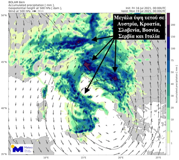 Γράφημα 1: Γεωδυναμικά ύψη (γραμμές) και αποκλίσεις αυτων (χρώματα) απο την μέση τιμή για την περίοδο 1981-2010 στην ισοβαρική επιφάνεια των 500 hPa. Κατά την κίνηση της αυτή η ατμοσφαιρική διαταραχή θα προκαλέσει εκτεταμένες βροχές και καταιγίδες στις ανατολικές Άλπεις (Αυστρία), στα δυτικά τμήματα της Βαλκανικής χερσονήσου (Κροατία, Σλοβενία, Βοσνία και Σερβία) και την Ιταλία όπου αναμένονται πολύ μεγάλα ύψη βροχής (Γράφημα 2).