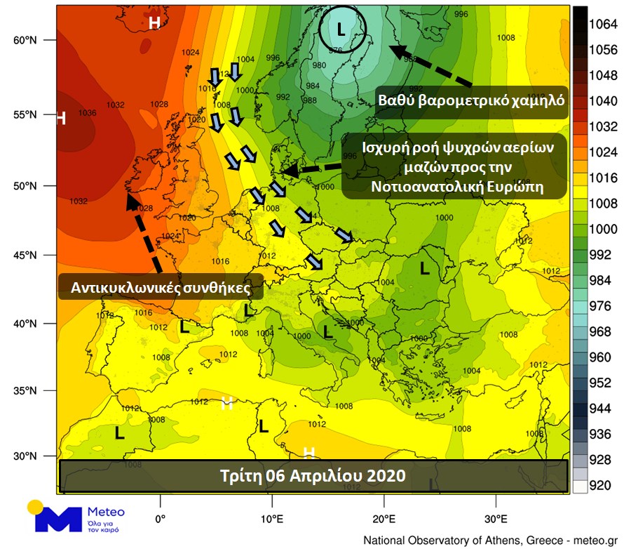 Σύμφωνα με το meteo.gr, η νέα ψυχρή εισβολή οφείλεται στο συνδυασμό ενός βαθέως χαμηλού στην περιοχή της Βόρειας Σκανδιναβίας και των έντονα αντικυκλωνικών συνθηκών δυτικά της Ιρλανδίας. Ο εν λόγω συνδυασμός έχει ως αποτέλεσμά την ενισχυμένη ροή ψυχρών αερίων μαζών προς τη Νοτιοανατολική Ευρώπη. Στον παρακάτω χάρτη φαίνονται οι θέσεις του χαμηλού και του αντικυκλώνα καθώς και η ισχυρή ροή των αερίων μαζών στην περιοχή μεταξύ των δύο βαρομετρικών συστημάτων.