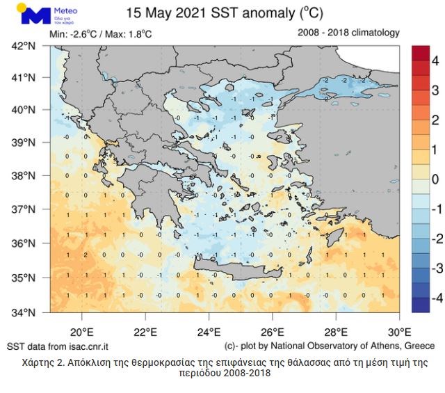Στον Χάρτη 2 αποτυπώνεται η απόκλιση της θερμοκρασίας της επιφάνειας της θάλασσας από την μέση τιμή της περιόδου 2008-2018. Είναι εμφανές ότι η απόκλιση αυτή σε καμία περίπτωση δεν είναι μεγαλύτερη του 1 έως 2 βαθμών Κελσίου.