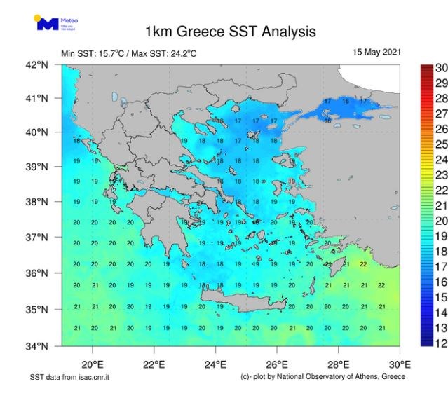 Στα κανονικά για την εποχή επίπεδα βρίσκεται η θερμοκρασία της επιφάνειας της θάλασσας σύμφωνα με τα διαθέσιμα στοιχεία του Εθνικού Αστεροσκοπείου Αθηνών / meteo.gr. Όπως φαίνεται στον Χάρτη 1 ο οποίος απεικονίζει την τιμή της για τις ελληνικές θάλασσες, αυτή κυμαίνεται από 17 βαθμούς Κελσίου στο Βόρειο Αιγαίο έως 21-22 βαθμούς Κελσίου στην περιοχή των Δωδεκανήσων.
