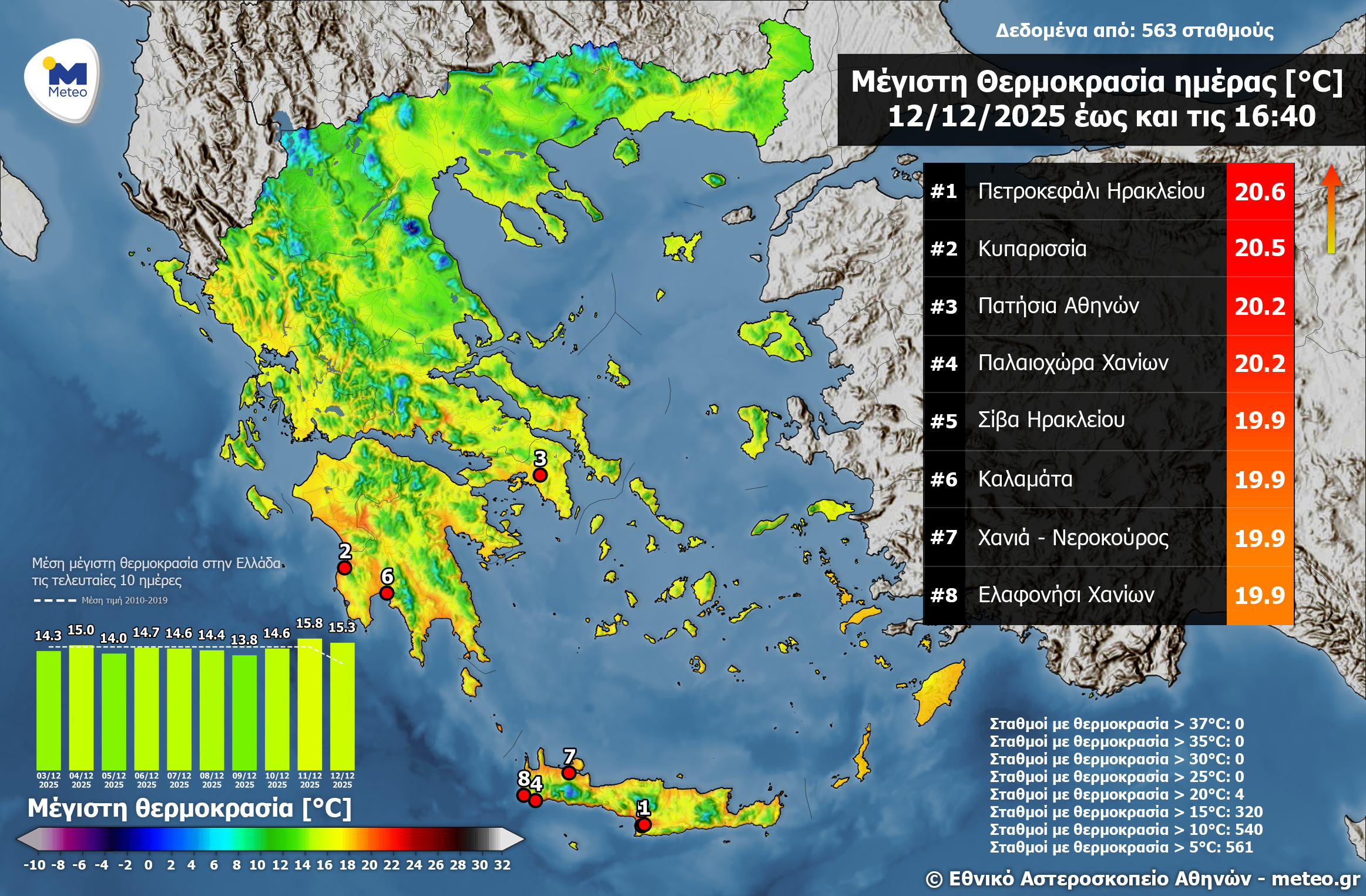 Στον χάρτη της εικόνα που ακολουθεί παρουσιάζεται η κατανομή της μέγιστης θερμοκρασίας την Παρασκευής 12/12 σύμφωνα με τις καταγραφές του δικτύου αυτόματων μετεωρολογικών σταθμών του meteo.gr / Εθνικού Αστεροσκοπείου Αθηνών.