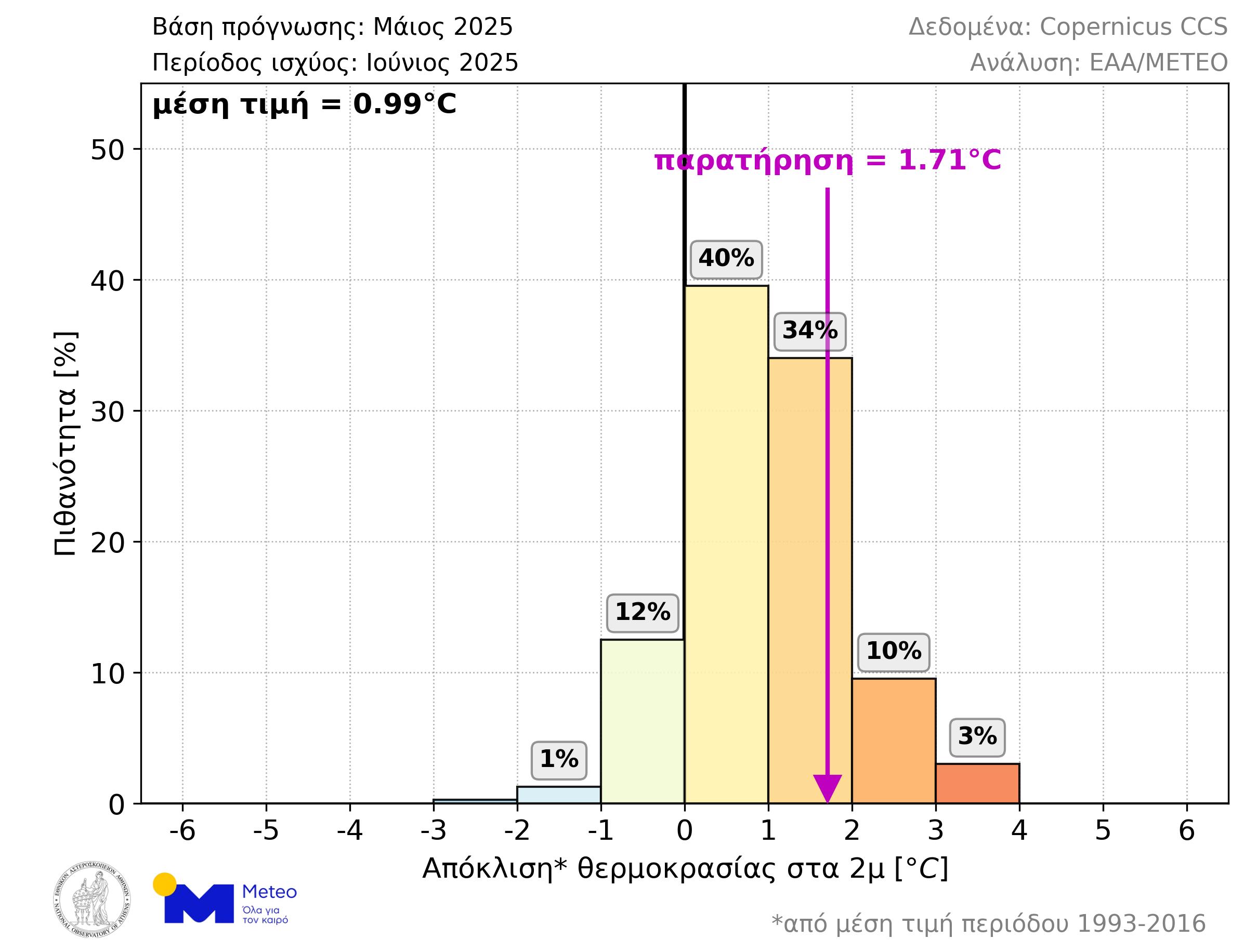 Όσον αφορά τον περασμένο Ιούνιο, η μέση θερμοκρασιακή απόκλιση στην ΝΑ Ευρώπη ήταν +1.71°C, ενώ η μέση τιμή όλων των σεναρίων της μακροπρόθεσμης πρόγνωσης που εκδόθηκε τον Μάιο του 2025 ήταν +0.99°C. Όπως φαίνεται στο παρακάτω γράφημα (Εικόνα 3), το μέγεθος της απόκλισης που παρατηρήθηκε είχε πιθανότητα 34% και ήταν το 2ο πιθανότερο πεδίο τιμών στην μακροπρόθεσμη πρόγνωση.